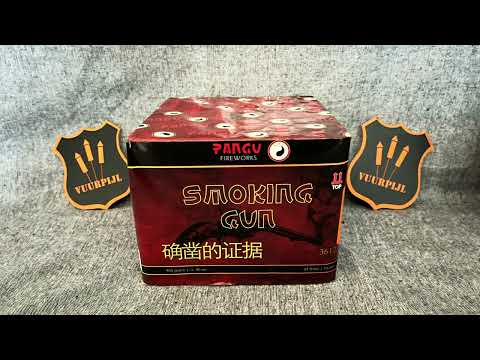 Effectomschrijving: Smoking Gun, 64 shots 20mm cake. Met deze cake uit de serie van Pangu Fireworks haalt u maar liefst 64 schoten siervuurwerk uit een relatief klein product. Afgewisseld schiet deze cake heldere blinkers, heftige crackling tails, gouden palmen, glitter palmen en een finale salvo met heftige crackling de hemel in. Een top cake in zijn diversiteit.